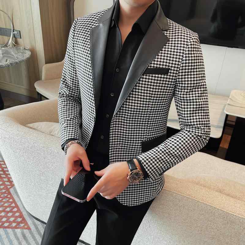 ジャケット メンズ スリムフィット チェック柄 レザー切り替え シングルブレスト ...