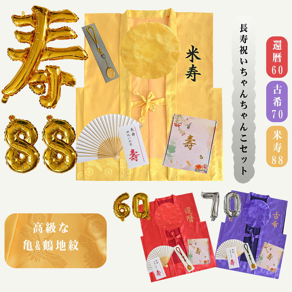 【豪華7点セット&木彫り&風船&赤紫黄3色】ちゃんちゃんこ 還暦祝い セット 敬老 鶴...