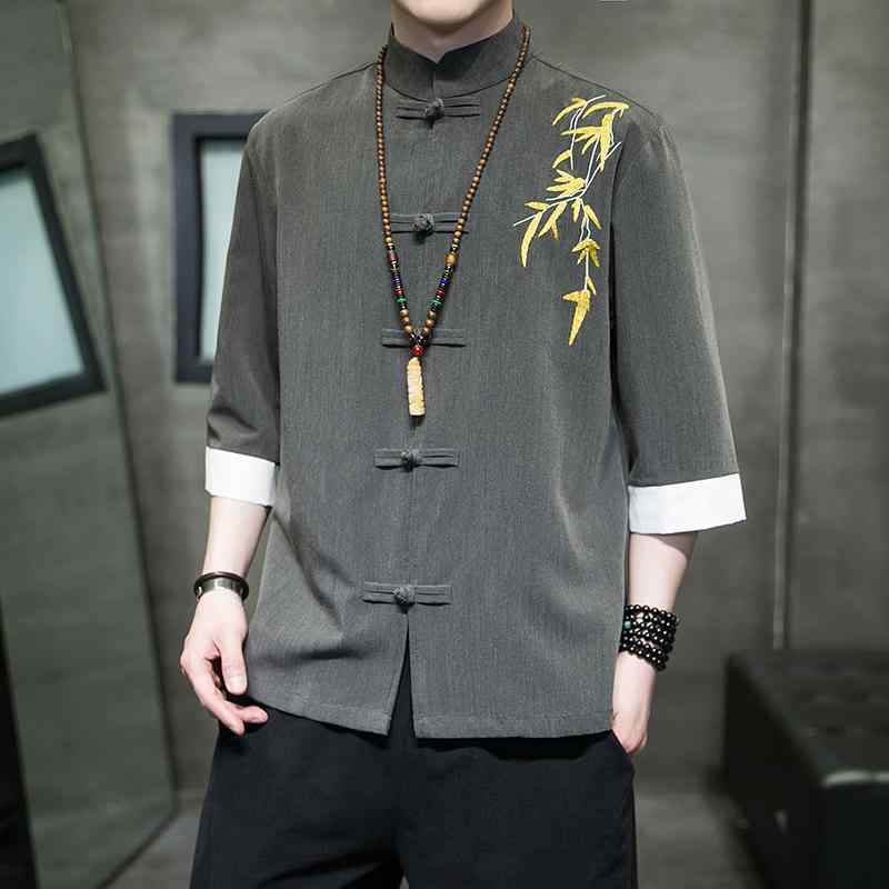 チャイナ風 シャツ メンズ トップス 夏 七分袖 長袖 半袖 竹 刺繍 ボタン 付き 薄...