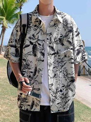 シャツ メンズ おしゃれ 夏 半袖 薄手 プリント リーフ柄 総柄 ビーチ ルーズ ゆっ...