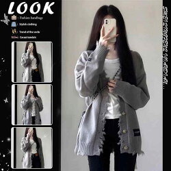 カーディガン レディース グレー ポリエステル Vネック 長袖 ニット トップス ゆっ...