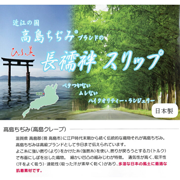 高島ちぢみ ひふ美 長襦袢スリップ 筒袖 高島クレープ 日本製 絽 半衿 衣紋抜き 汗取り 琵琶湖畔 天然素材 着物肌着 和装肌着 長襦袢 着物スリップ べたつかない、ムレない、ハイクオリティーランジェリー