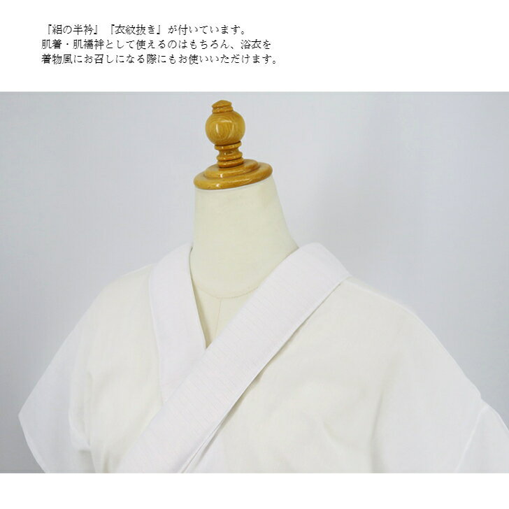 【高島ちぢみブランドの 長襦袢スリップ】夏や汗ばむ季節の浴衣、着物の長襦袢、スリップ、インナーワンピースとして使える高島ちぢみの長襦袢スリップ絽の半衿、衣紋抜き、紐付爽やかな着心地を追求した「高島ちぢみ」の楊柳クレープ生地安心高品質の日本製肌着、肌襦袢として使えるのはもちろん浴衣を着物風に着る時にもお使いいただけます筒袖なので、仕事着や普段着など、襦袢の袂(袖)がいらない時に便利です 洒落着から普段着や浴衣まで着心地が良くお洗濯後もすぐ乾き、お手入れが簡単なので普段使いにもオススメです汗をよく吸い早く乾きます汗をかいても肌にはり付かずベトつかない爽やかな肌ざわりで涼しい 10