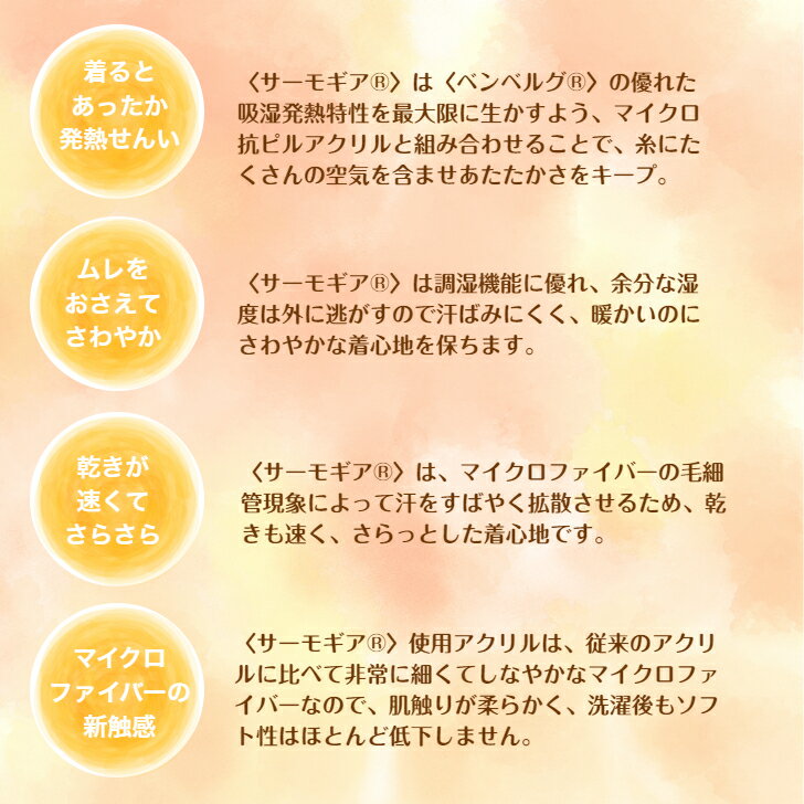 〈サーモギア®〉は〈ベンベルグ®〉とマイクロ抗ピルアクリルを組み合わせた、吸湿発熱性・調湿機能に優れるソフトな触感の新あったかせんいです。