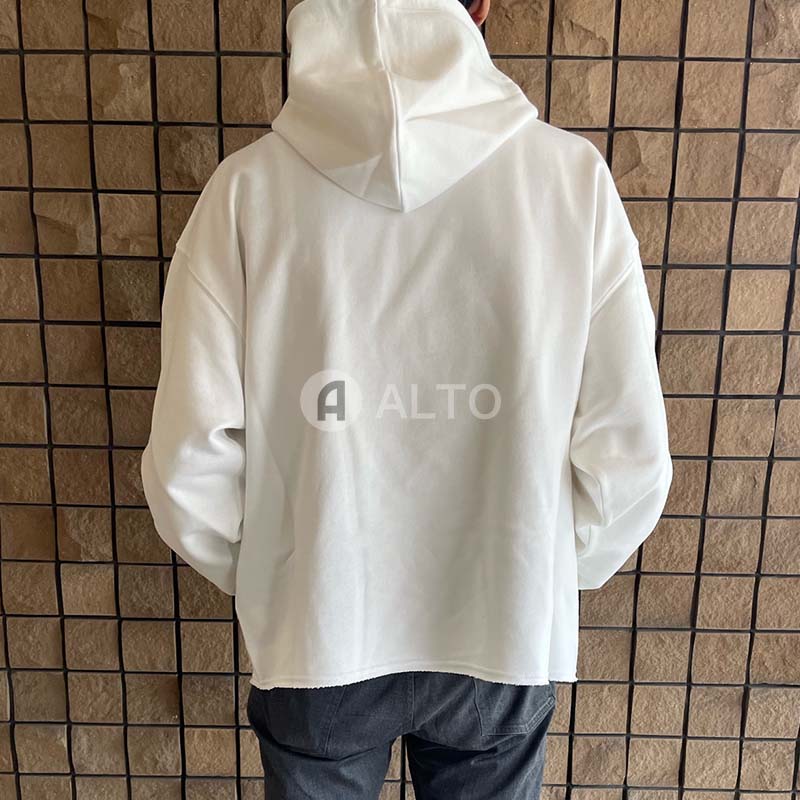 フロントのカンガルーポケットとミニロゴがかわいく、裾口の切りっぱなしのデザインが特徴です。
