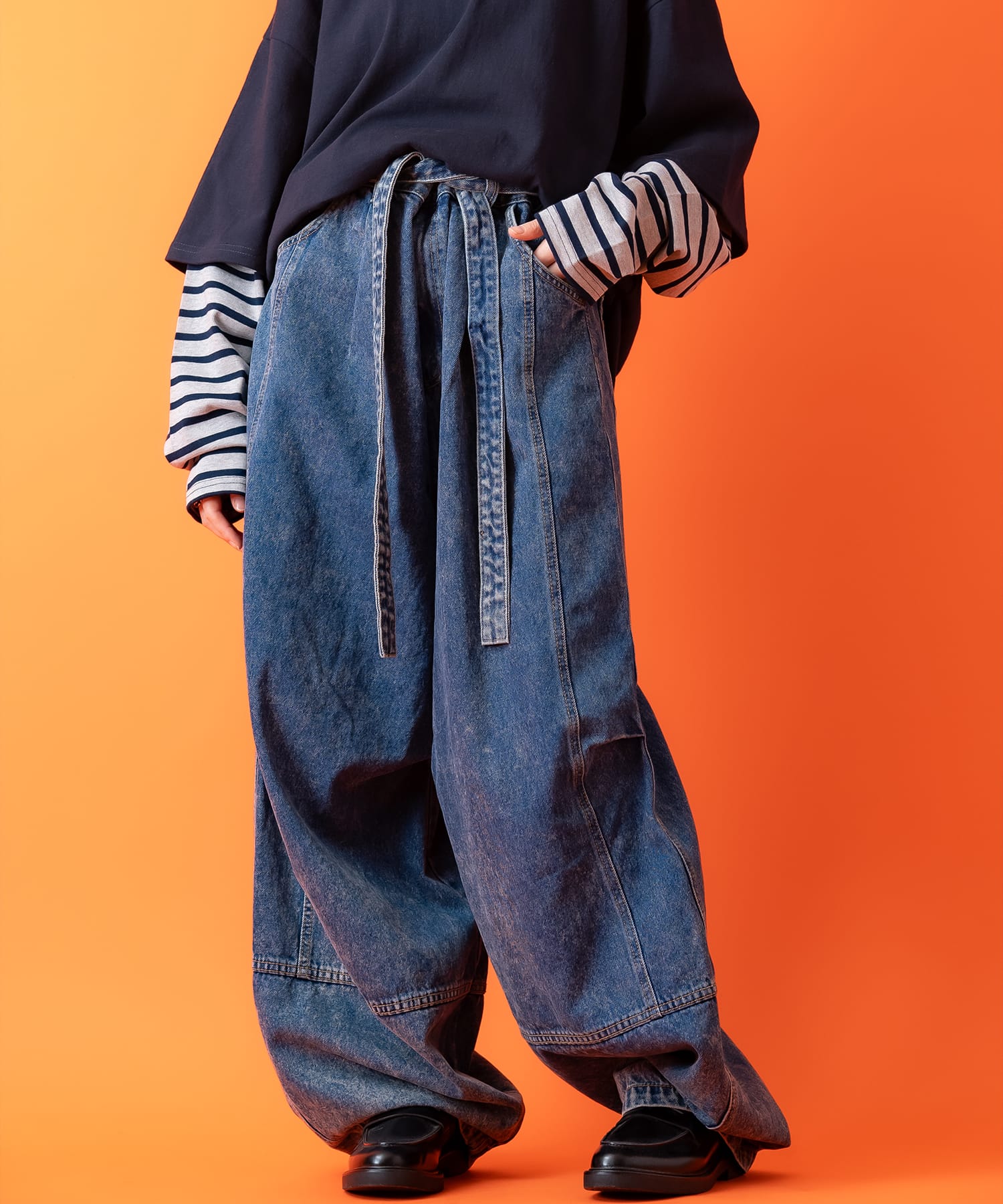 ウエストに備え付けたロングコードベルトを縛って垂らすモロに90sストリートノリなギミックが逆に今新鮮。
