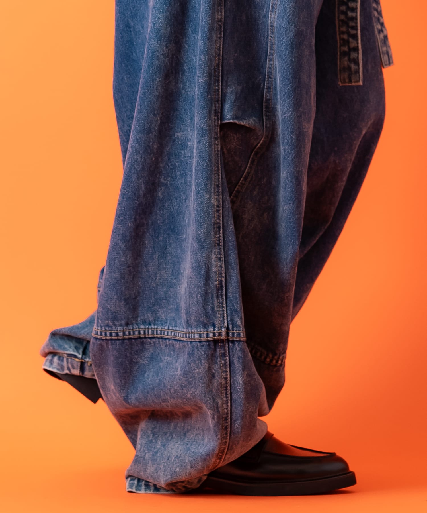 ウエストロングベルトワイドバレルレッグオーバーダイデニムパンツ / ジーンズ メンズ レディース ユニセックス ビンテージ加工レトロな雰囲気とY2K、90sやアメカジ、古着ミックススタイルなどの台頭で注目のビンテージライクなウォッシュド加工デニムパンツ。
