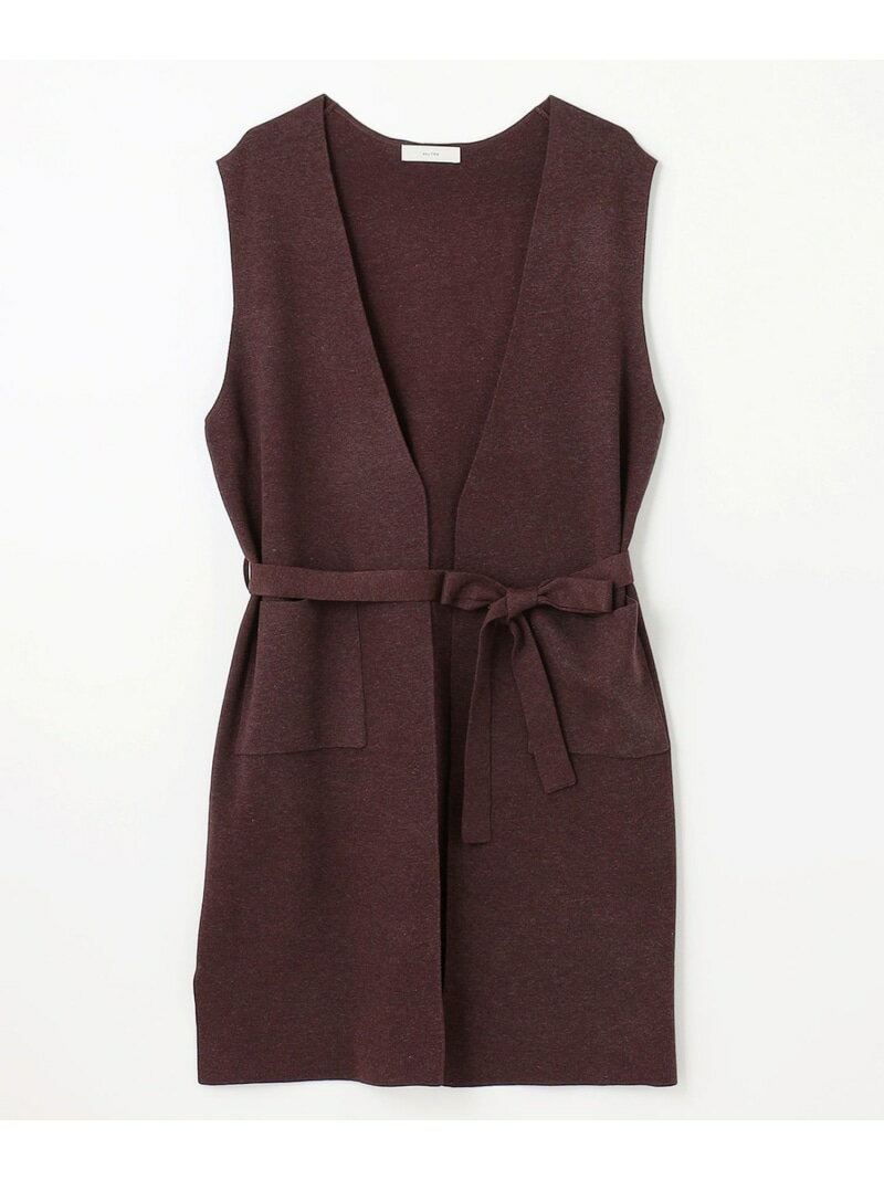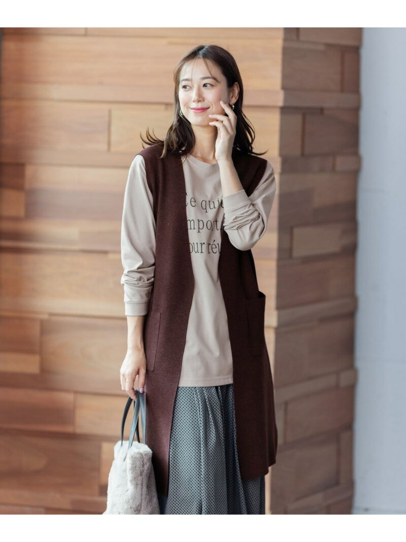 シャツブラウスやカットソーと合わせて、前を開けて着ることで、縦のラインが強調されスタイル良く見せてくれます。