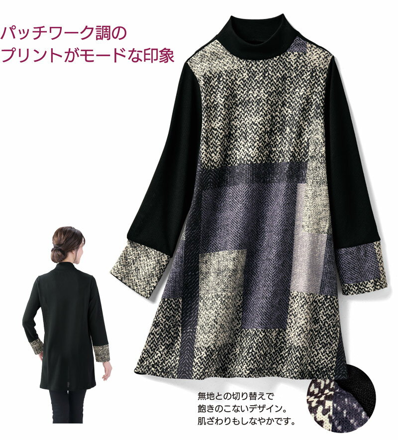 肌ざわりもしなやかで、着心地はとても良いですよ♪ ◆素材 ポリエステル97%、ポリウレタン3% ◆サイズ(約:単位cm):M/L/LL/3L バスト:98/102/106/110 身丈:82/83/84/85 ◆洗濯 手洗い ◆その他 柄の出方は商品によって異なります {関連検索キーワード} レディース 女性 婦人 洋服 ファッション おしゃれ 暖かい 落ち着いたデザイン 肌触りが良いパッチワーク調のプリントがモードな印象 無地との切り替えで、飽きのこないデザイン 肌ざわりもしなやかです。