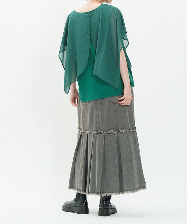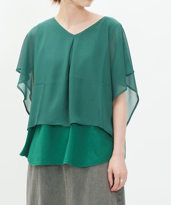 涼しげなシフォン素材でポンチョ風のデザインにすることで華奢見せ効果はバツグン◎バックスタイルの重なりのデザインで後ろ姿まで抜かりなく!首回りは開きすぎないVネックが上品かつ顔周りをすっきりと見せてくれます。