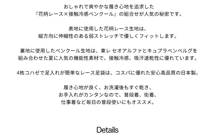おしゃれで爽やかな履き心地を追求した『花柄レース×接触冷感ベンクール』の組合せが人気の秘密です。