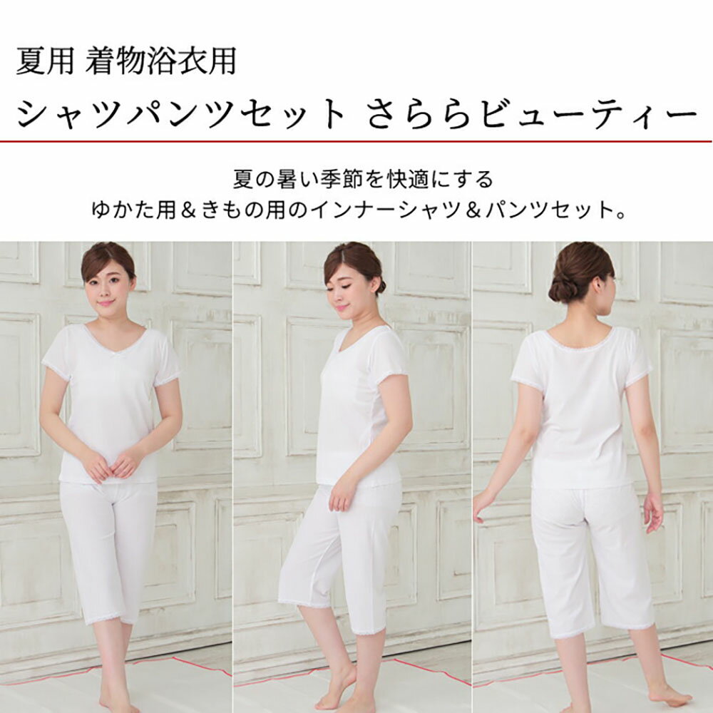 特長 [さららビューティー 着物 浴衣 インナー シャツ&パンツセット] 東レのクールでドライな吸汗・速乾・快適機能性原糸を使用した『さららビューティー シリーズ』 さらさらとした肌触りで、夏の暑い季節を快適にする浴衣、着物用のインナーシャツです。