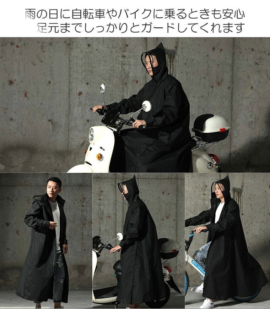 ■商品説明 雨の日でもオシャレにキメるレインコート! 雨の日に自転車やバイクに乗るときも安心 足元までしっかりとガードしてくれます フードは被った状態でも 視界を確保しやすいデザインになっています サイドのスリットをオープンにすることで ゆったりと使用することも可能です フードはホック式で簡単に着脱が可能です 取り外したフードはそのまま収納ケースとしてお使い頂けます