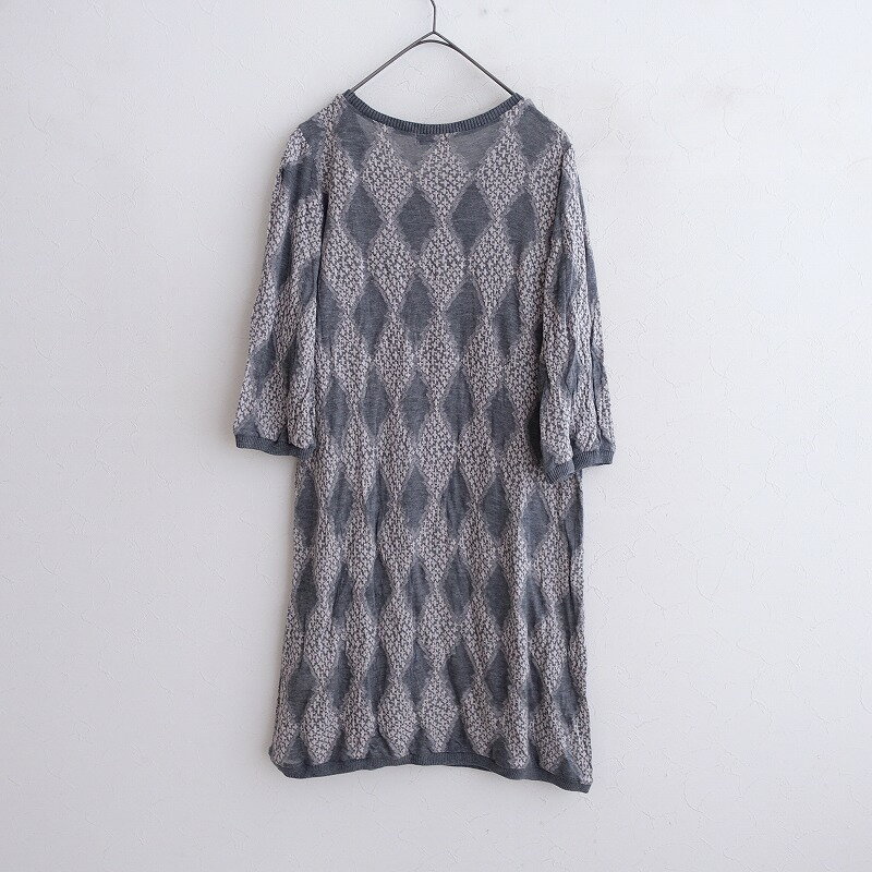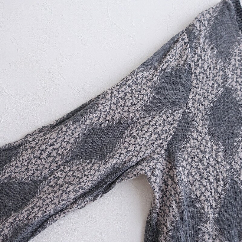カラーはグレー×淡いピンクベージュの総柄で、やや透け感のある薄手ニット地です。