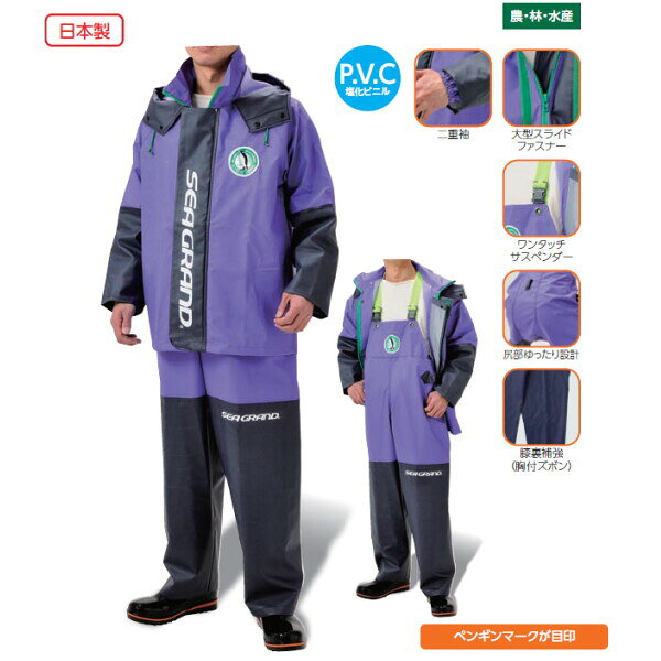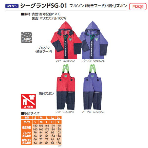 コメント【上着のみ】MEN’シーグランドSG-01 ブルゾン(続きフード)/日本製■素材:表面:耐寒配合P.V.C裏面:ポリエステル100%■総厚:0.40mm農・林・水産ペンギンマークが目印サイズ(適応身長)/ブルゾン適応胸囲S(150-160)/78-86M(155-165)/84-92L(165-175)/90-98LL(170-180)/96-1043L(175-185)/102-110