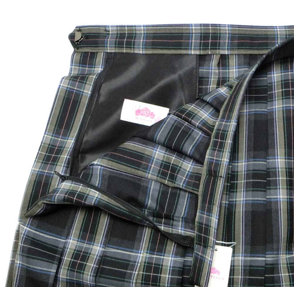 アイラブ制服特注 スクールスカート ブラックベースにチャコールグレー、カーキ、パープル、オレンジ、グリーンブルー、白の多色チェック柄。