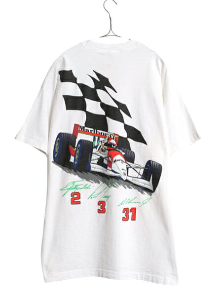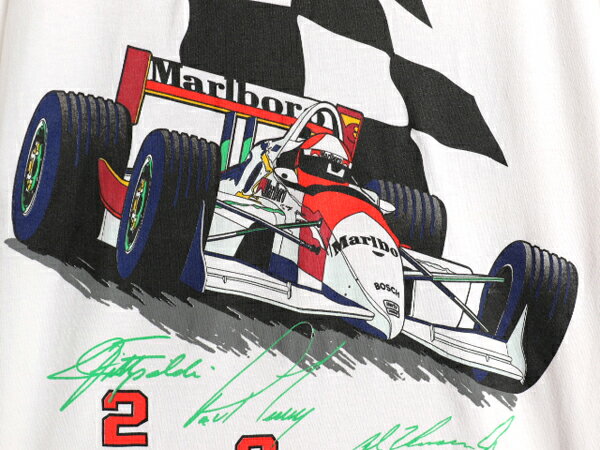 袖、裾共にシングルステッチのオールドボディ MADE IN USA ( アメリカ製 ) 合わせやすいホワイト 両面に1994年に行われたCART12戦で ペンスキー・レーシング チームが 1位から3位を総なめにしたメモリアルプリント入り 両面にチェッカーフラッグ、 左胸にパッチポケットとMarlboroロゴ バックに 大判のフォーミュラカーのイラストと 1着 No31 アル・アンサー Jr 2着 No3 ポール・トイレシー 3着 No2 エマーソン・フィッティパルディ の シグネーチャープリント 現行ではあまり見られない コストのかかる細かいタッチの多色刷り ゆったりとした人気のシルエット 世界的評価の高まるオールドの企業物 その中でも近年、価格が高騰しているマルボロのTシャツ こう言った商品はいつでも手に入る物ではありません。