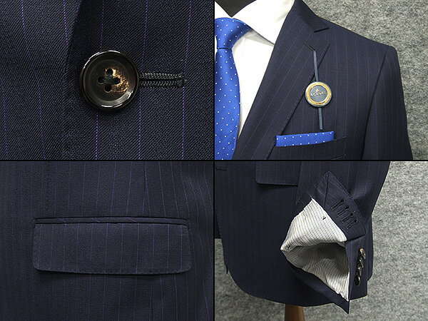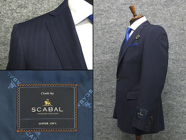 スキャバル Super120's オーダー生地使用 ☆通年背抜き ☆紺系☆ストライプ☆ロゴ入り裏地 ☆スタイリッシュ2釦シングルスーツ 生地だけでなく裏地、釦、仕立てにもこだわった逸品 日本縫製 商品詳細 紺系:ストライプ 2ボタン:シングルスーツ 色 紺 やや艶あり 柄 織柄&ペンシルストライプ(綾織系) 筋糸:パープル 表地(混率) 毛100% SUPER120sウール使用 Fabric made in England 裏地 胴 キュプラ(ロゴ入り) 袖 キュプラ ベント センターベント スラックス ノータック (テーパードパンツ) ローライズ仕様のため実ウエストは 表記サイズより約2cmアップしております シルエット 細身 (スリムタイプ) 対応季節 背抜き裏地(観音開き) 通年 仕様 AMFステッチ イタリアン台場仕立 裏地:ピンポンステッチ 短丈(普通タイプのスーツより3cm程度) 本水牛釦 脇汗パット 袖口本切羽(袖直しできません) スラックス:ヒザ裏・滑り止め付 日本製 ロゴ入りジャガード裏地使用 メーカー小売 希望価格 188,000円(税別) 特徴 Super120sウールを使用し、上質なクオリティが正統派エレガンスを演出し、英国紳士のさりげない凛々しさを感じさせるスーツに仕上がっています。