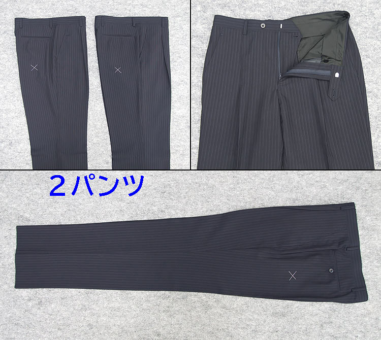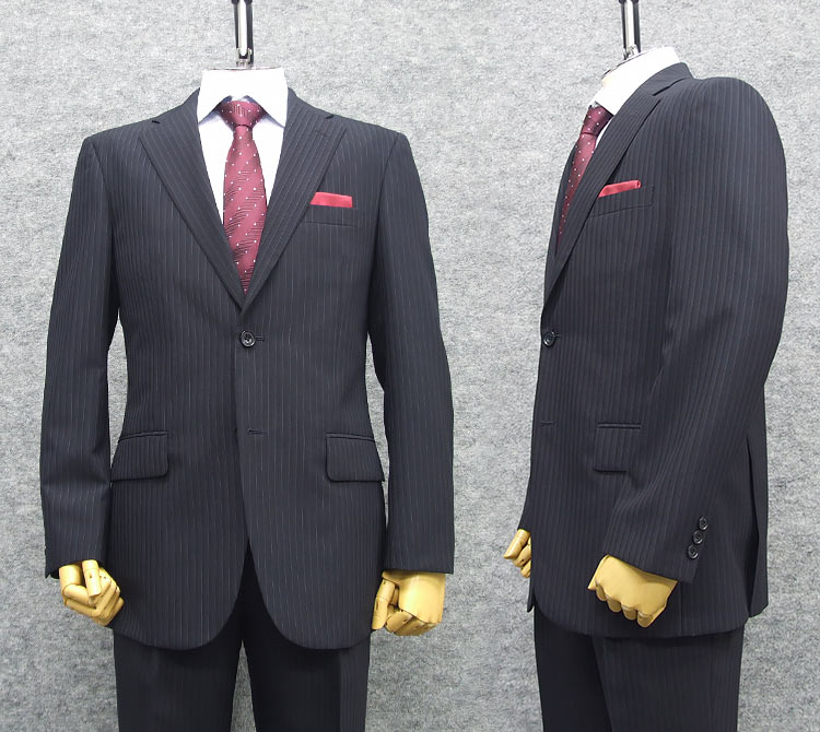 ☆春夏物☆2パンツ ☆紺☆ストライプ ☆ベーシック2釦シングルスーツ 商品詳細 紺:ストライプ 2ボタン:シングルスーツ 色 紺 柄 オルタネイトストライプ 表地(混率) ポリエステル70% 毛30% 裏地 ポリエステル ベント サイドベンツ スラックス ワンタック スペアーパンツ付 対応季節 春夏 シルエット 普通 仕様 AMFステッチ 角台場仕立て 水平ポケット 裏地見返し:ピンポンステッチ 脇汗パッド スラックス:ヒザ当て付 持ち出し剣型3点留め 特徴 パンツのみ家庭洗濯可 (ネット使用)
