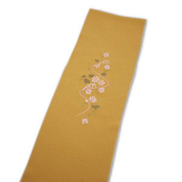 お洒落な縮緬生地の刺繍半衿。【色柄】金茶色地にピンク系等の花柄の刺繍。【素材】本体生地:ポリエステル100% 刺繍糸:レーヨン100%