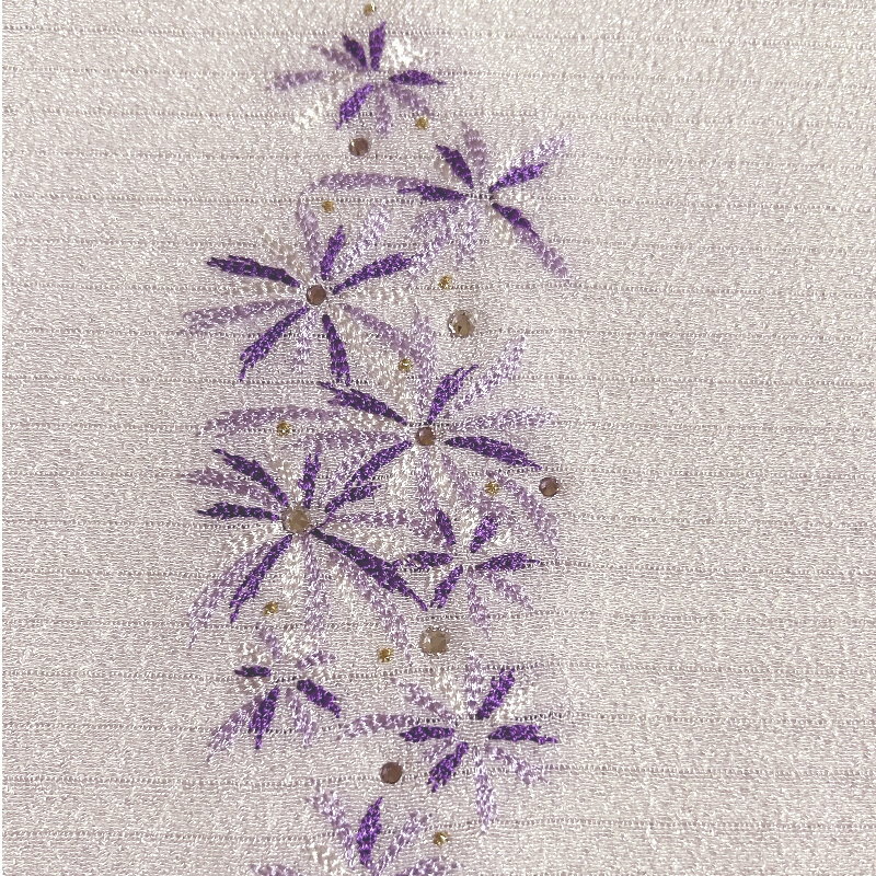 夏用の絽の刺繍半衿。素敵な柄入りです。 半衿を変えて着物を楽しんでみませんか? 洗える生地ですので、しわになりにくく、乾きが速いので夏場はとても重宝します。 【色 柄】白地の絽縮緬生地にパープルの花火の刺繍柄とキラキラ光るラインストーン。 【素 材】ポリエステル100%