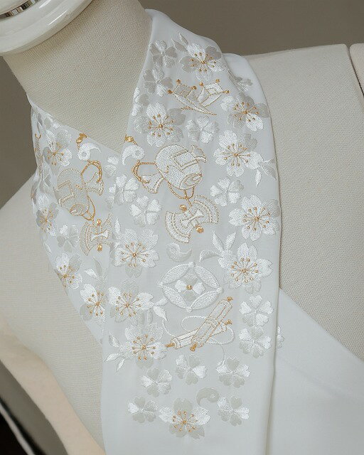 柄等はお着物に合わせやすい白地に光沢のある白色や金色にて花柄や寿柄があります。