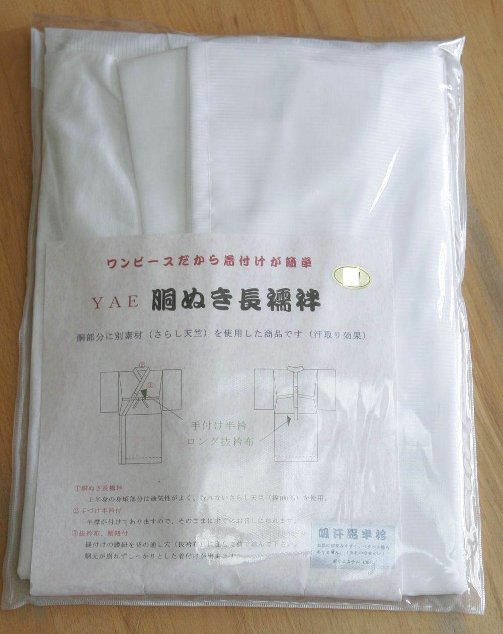 【1】胴ぬき長襦袢 上半身の身頃部分に綿100%のむれにくいさらし天竺を使用しているので、通気性が大変良くなっています。