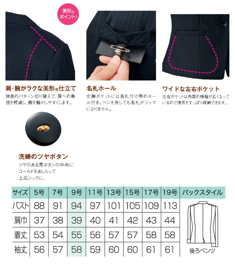 ■素材 レーシーストライプ 毛50%・ポリエステル35% 複合繊維(ポリエステル)15% [特徴] ・名札ホール ・内ポケット付 ・ストレッチ素材 ・伸縮・制電裏地 ・ホームクリーニング ※取り寄せ商品、在庫有無、納期後日連絡 サイズ17号・19号はこちら ★ 関連シリーズを全て見る★ 関連シリーズを全て見る