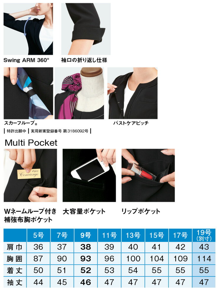 ■機能 ・ストレッチ ・速乾 ・消臭 ・半背裏 ・袖裏なし ・ARM360° ・マルチポケット ・スカーフループ ・バストケア ・ホームクリーニング