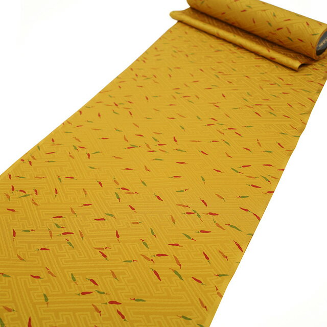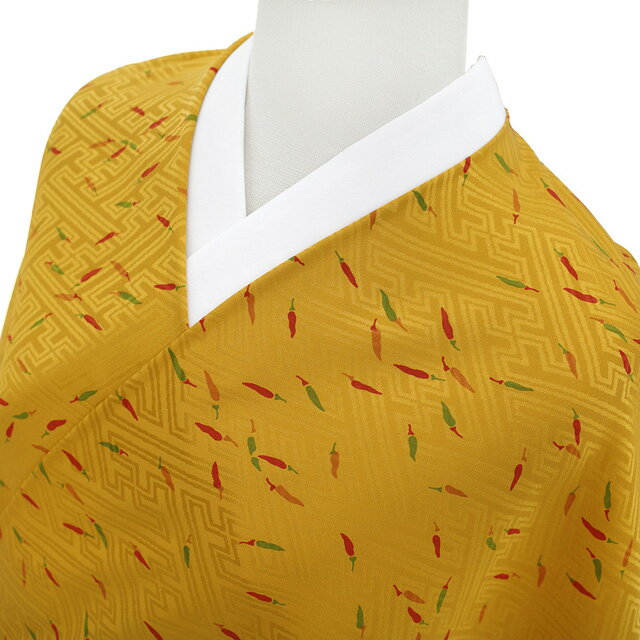 こちらの 長襦袢 は、山吹茶色の地に唐辛子柄があしらわれた、どこか遊び心を感じる一反。