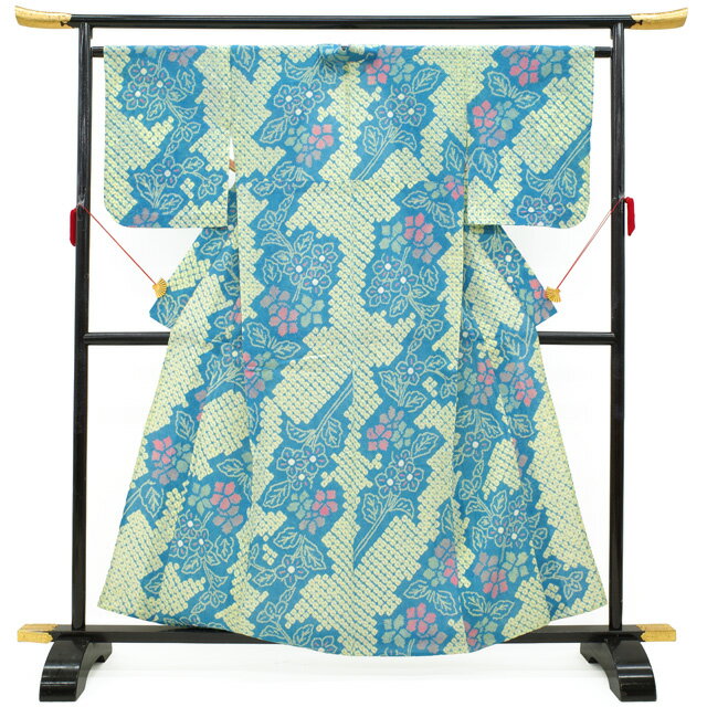 こちらの 浴衣 は、薄藍色地に 薄黄色や朱赤・茶・グリーンで花が美しく絞りにて施されています。