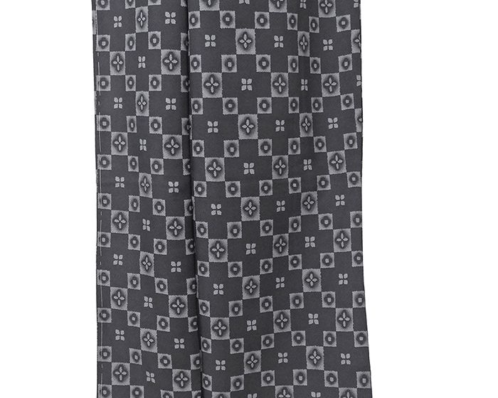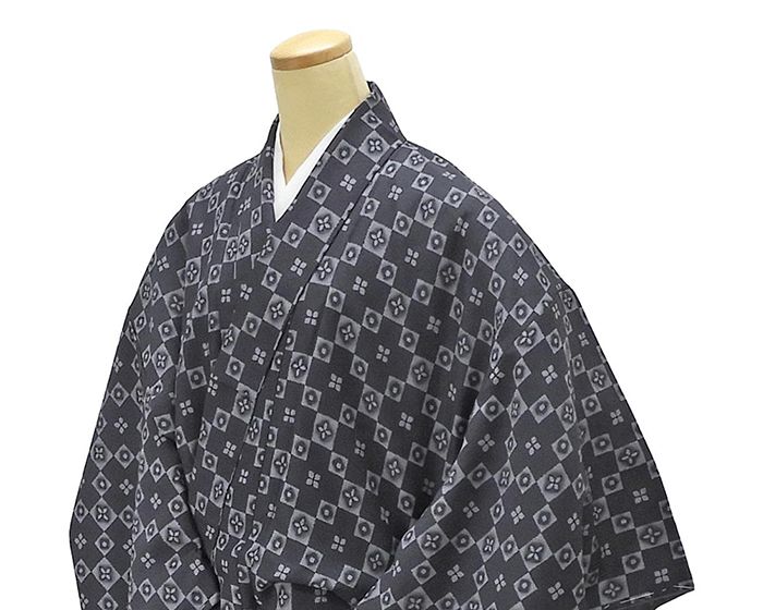 ◆表地色:チャコールグレー×灰色の濃淡 ◆八掛色:グレー ◆柄:格子花幾何模様 ◆サイズ:身丈163cm/裄丈68cm/袖丈49cm/L寸 ◆素材:ポリエステル100% ◆袷せ仕立 ◆中国製