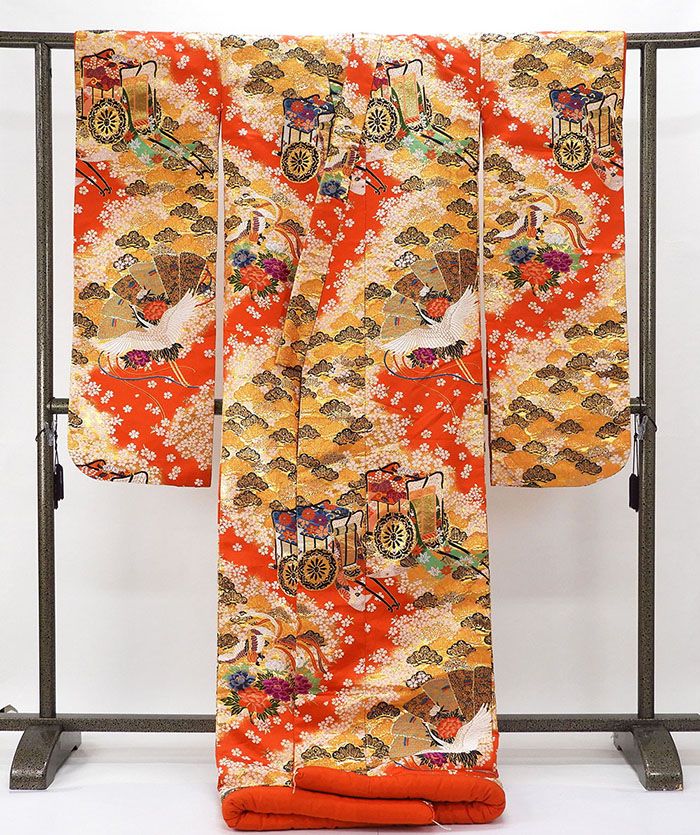 日本の伝統的な文様である御所車や松・牡丹そして優雅に舞う鶴を描いた色打掛です。