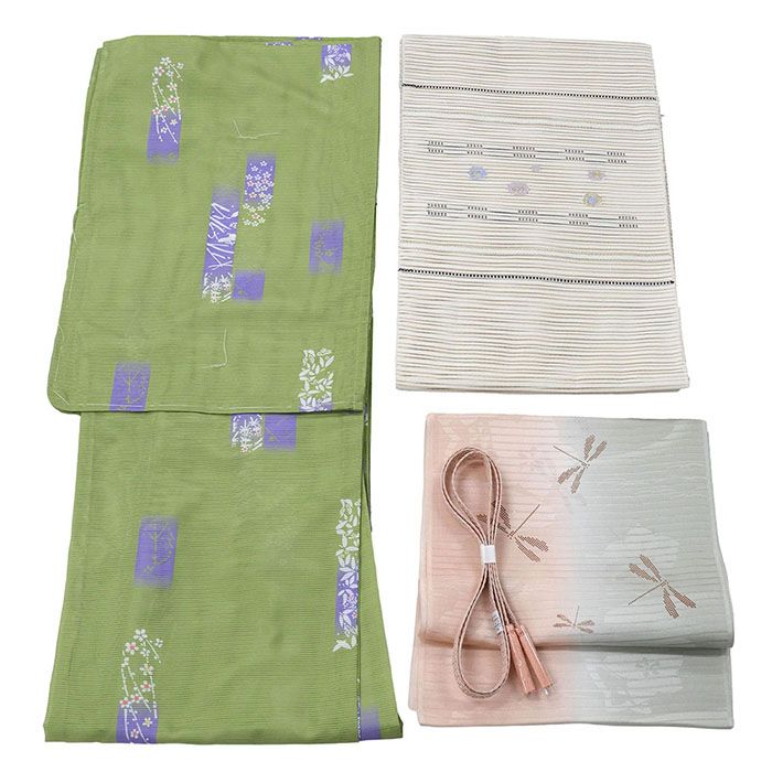ポリエステル夏着物・正絹 夏帯/絽綴れ・正絹 帯締め・正絹 帯揚げ コーディネートに悩まないお洒落な夏着物のセット。