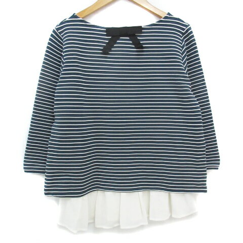【中古】グローブ grove カットソー フレア 七分袖 ラウンドネック 切替 バックリボン ボーダー柄 M 白 ダークグリーン 緑 ホワイト /FF27 レディース