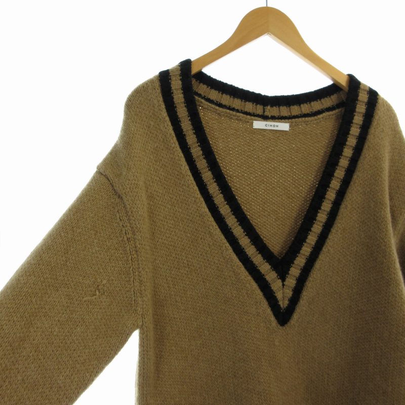 【中古】チノ CINOH V Neck Leather Pocket Knit ニット セーター チュニック Vネック ビックシルエット 長袖 38 M 茶 ブラウン 18WKN032 /RO