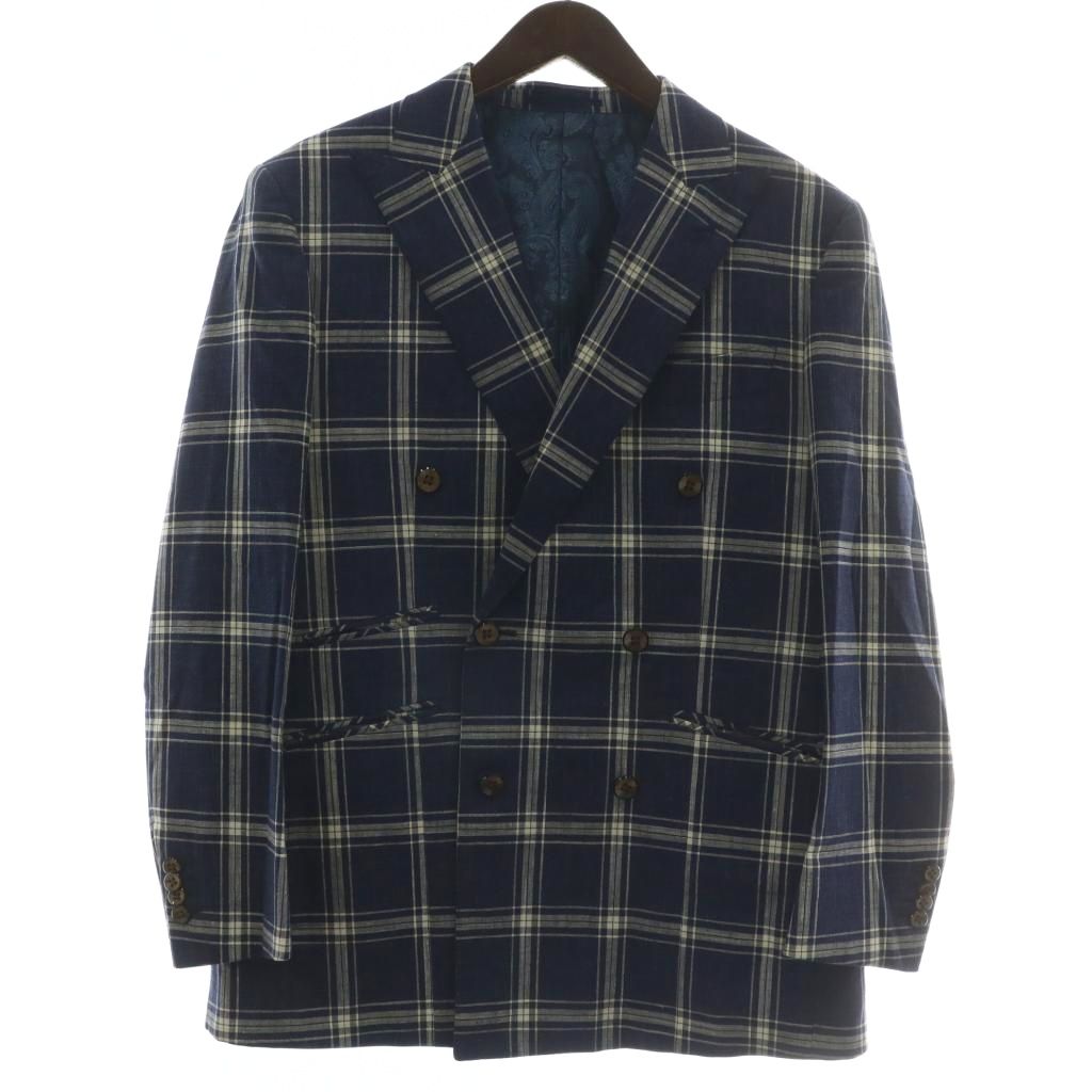 【中古】グローバルスタイル カイザー Global Style KAISER Tollegno 1900 トレーニョ社製生地 3ピース スーツ セットアップ 3点 セット テーラードジャケット ダブル 6B 背抜き ジレ ベスト パンツ スラックス ウール リネン混 チェック柄 紺