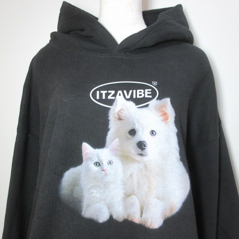 【中古】イッザバイブ ITZAVIBE 美品 CAT&DOG FRIENDS HOODIE パーカー プルオーバー 長袖 プリント 裏毛 M 黒 ブラック /X レディース