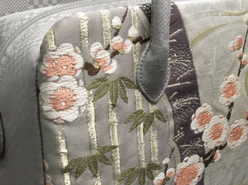 国産帯地のグレー地に梅・竹・流水など日本的な柄が織り込まれています。
