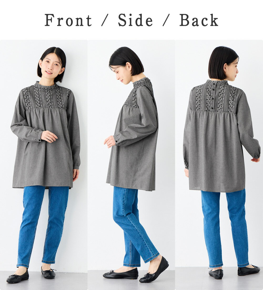 ●ポイント・お顔回りがぱっと華やぐナチュラル感漂う刺しゅうデザインが、大人可愛いチュニックブラウス。