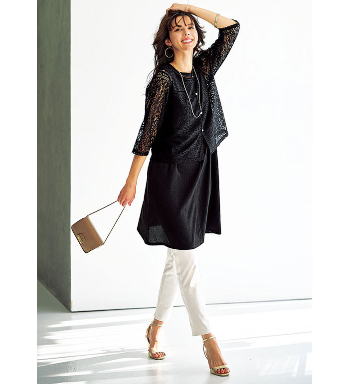 【ここがポイント!】異素材使いが調和する涼感レース柄上品アンサンブル短め丈のレースカーデと、ノースリーブワンピースのセット。