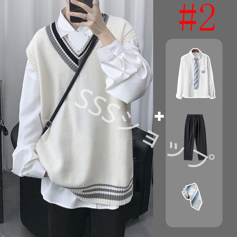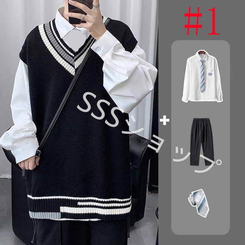 商品紹介DK 制服 セット なんちゃって制服 セット制服 Vネック コスプレ 上下セット 制服 4点セット素材:ポリエステルセット内容:ベスト+ ズボン + シャツ + ネクタイイ