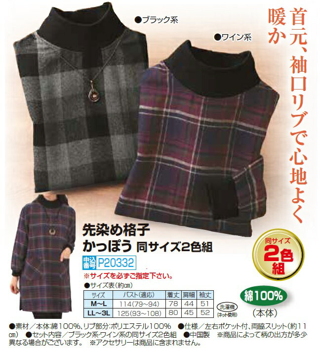 首元、袖口リブで心地よく暖か ●素材/本体:綿100%、リブ部分:ポリエステル100% ●仕様/左右ポケット付、両脇スリット(約11cm) ●セット内容/ブラック系・ワイン系の同サイズ2色組 ●中国製
