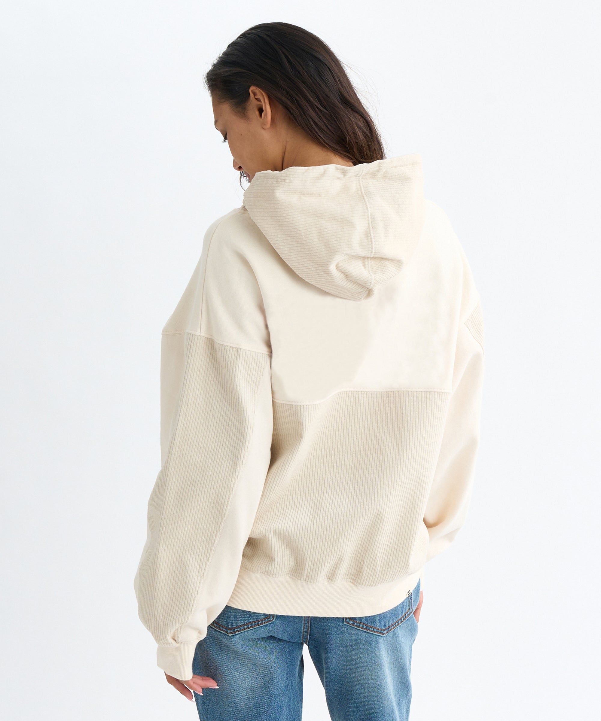 裏毛とストレッチコーデュロイの切り替えデザインが個性的なプルオーバーフーディー。