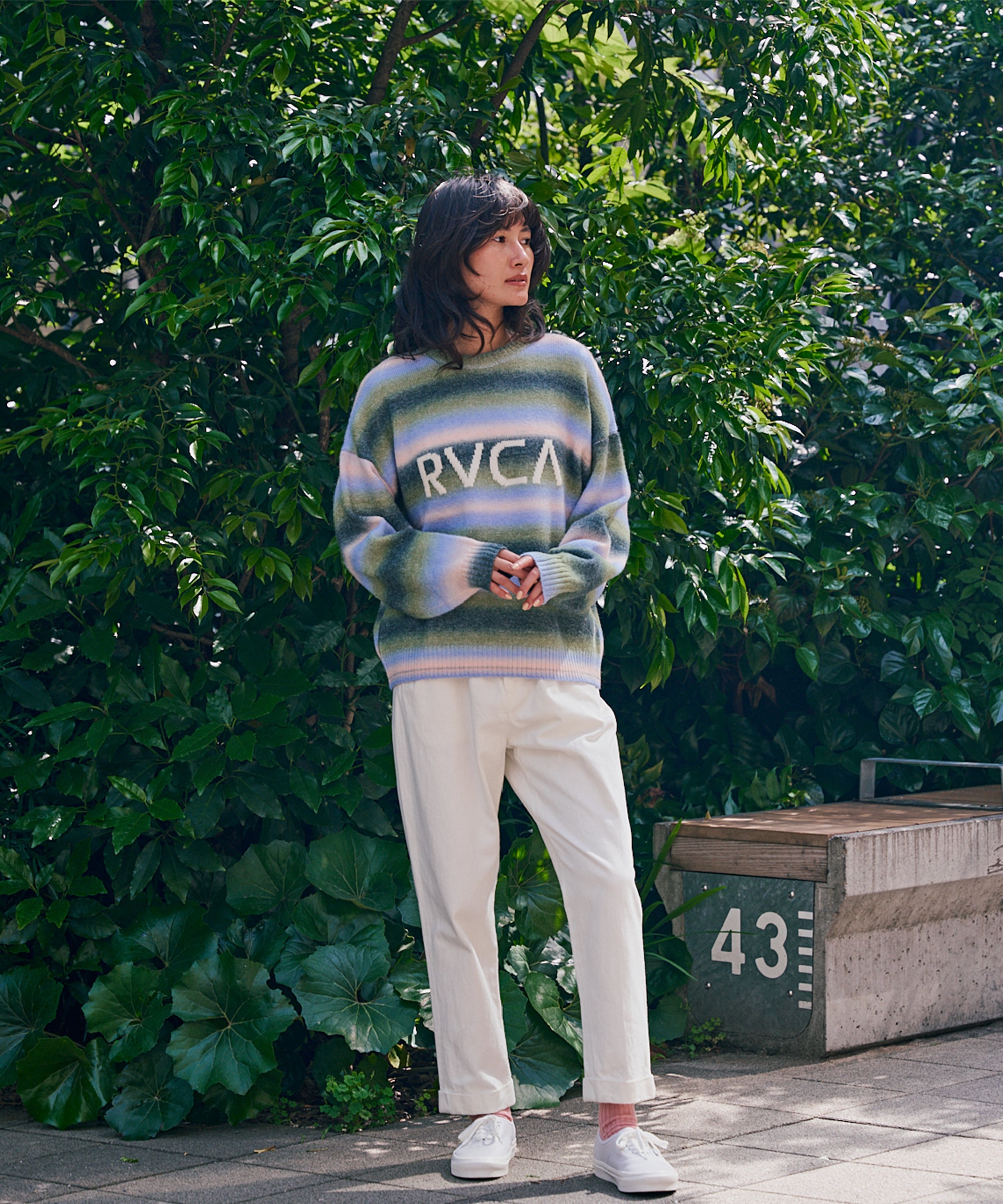 ボーダー調のボディー前面に、ジャカードで表現されたRVCAのロゴが特徴。