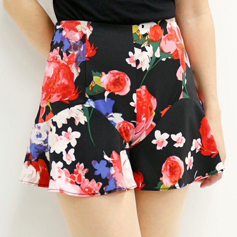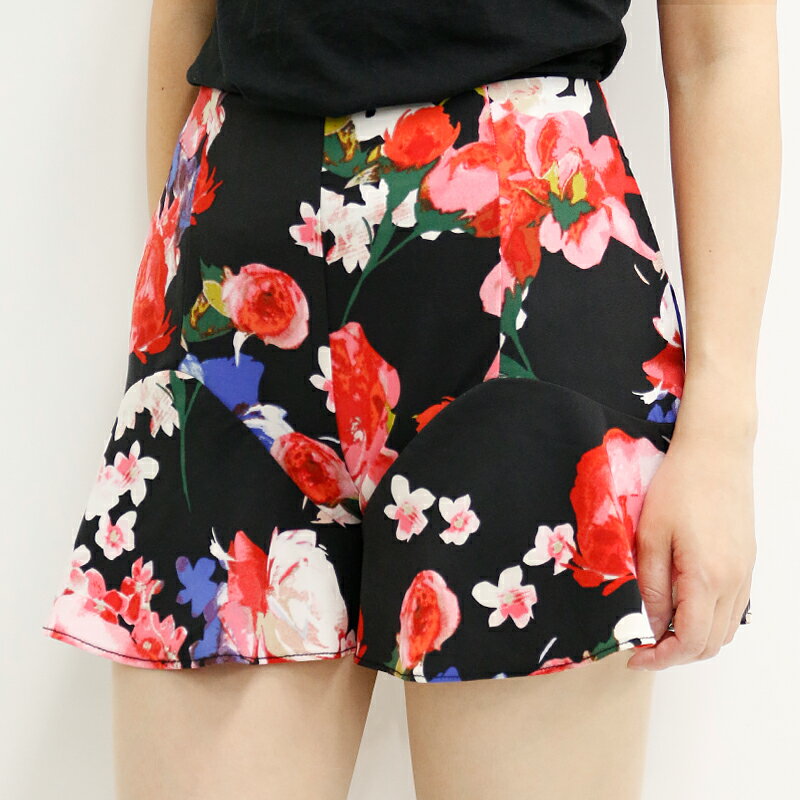 【備考】 ブラックのベースに鮮やかな赤い花がプリントされたペプラム(裾にフリルの飾りがつけられた)ショーツ。