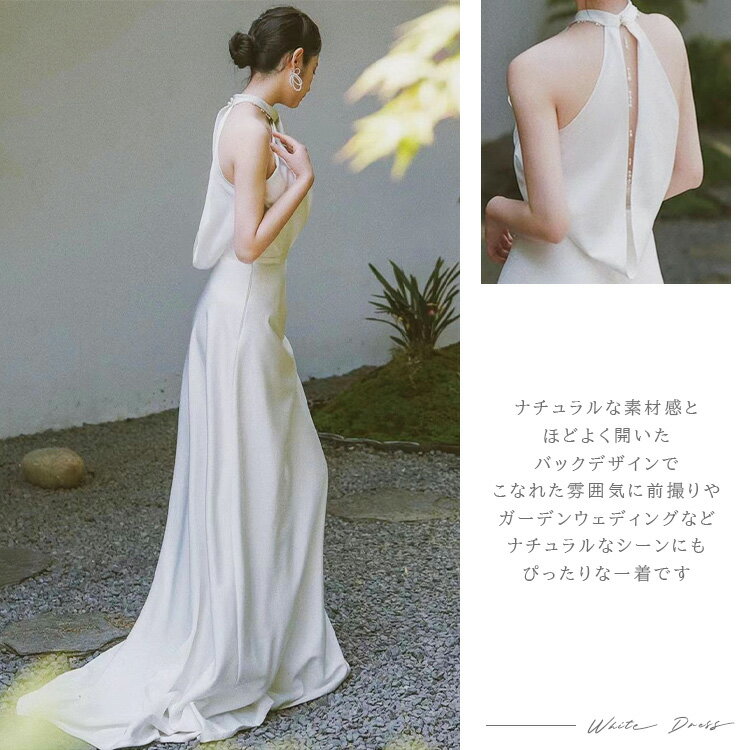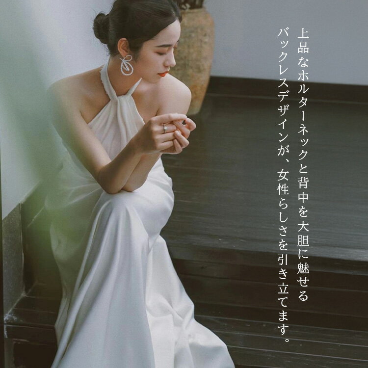 肌見せも上品に叶えるバックレスデザインドレス♪ 商品詳細 ・シルエット: スレンダーライン ・背面デザイン: ファスナー ・裾のデザイン: トレーン ・ネックライン: ホルターネック ・カラー: ホワイト ・長さ: ロング ・生地: ポリエステル サイズ