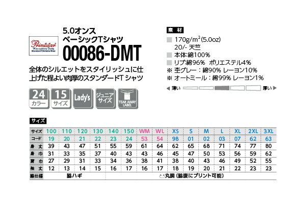 ※ウーマンサイズ(WM・WL)は首リブが細く、襟ぐりを広めにし女性らしい仕様となっています。