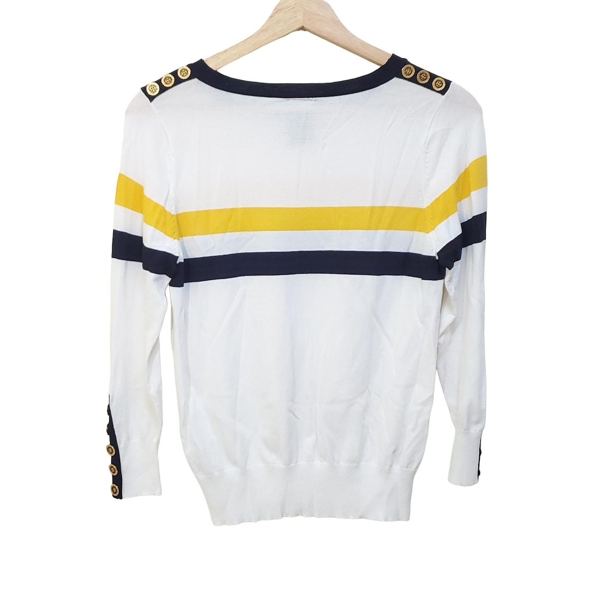 【中古】DOUBLE STANDARD CLOTHING(ダブルスタンダードクロージング) 半袖セーター ボーダー/春・秋物 白×ネイビー×イエロー ジャンル 半袖セーター ブランド DOUBLE STANDARD CLOTHING(ダブルスタンダードクロージング) 商品名 -型番 -男女別 レディース表記サイズ なし実寸サイズ 肩幅 : 約 37 cm袖丈 : 約 50 cm身幅 : 約 40 cm着丈 : 約 52 cmカラー 白×ネイビー×イエローデザイン -ボーダー/春・秋物 素材 画像参照コンディションレベル