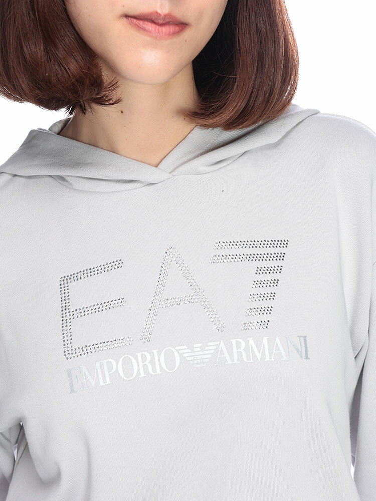 ブランドロゴをラインストーンで華やかに表現した、エンポリオアルマーニのプルオーバーパーカー。